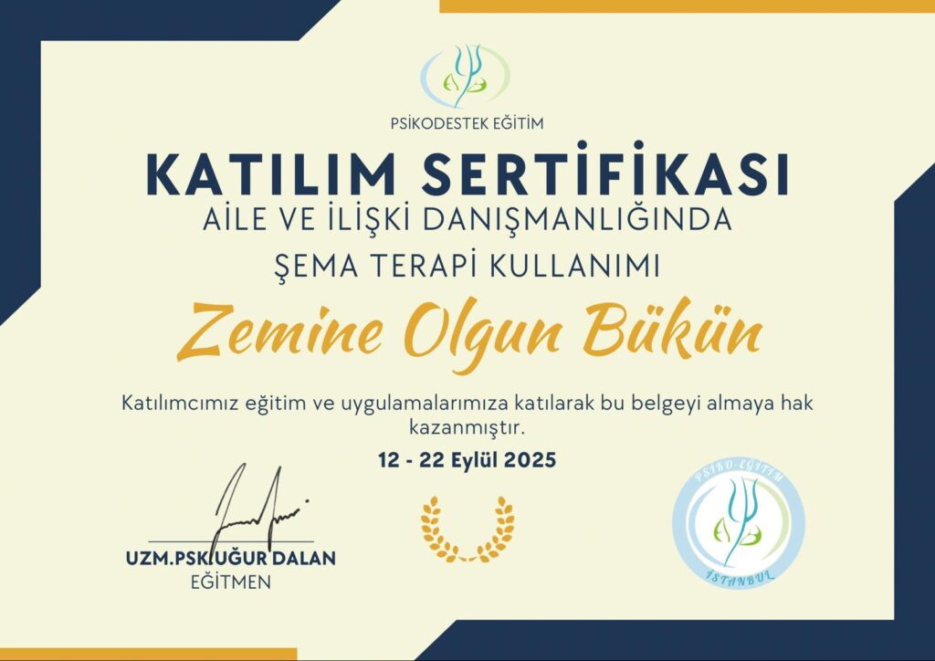Uzman Aile Danışmanı Zemine Olgun Bükün Duygu Odaklı Terapi ,bilişsel davranışçı terapi ve şema terapi ekolleri ile çalışma yapmaktadır. Kocaeli Darıca ilçesinde ayrıca yetişkin ve çiftlere danışmanlık hizmeti ve online terapi, online danışmanlık hizmeti de vermektedir. İyi derecede İngilizce orta derecede Fransızca bilmekte olan Zemine Olgun Bükün 28 yıllık evlidir. Ve biri öğretim üyesi diğeri doktor olan iki çocuk annesidir.